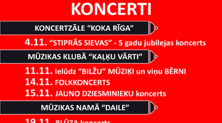 Laikā no 4. novembra līdz 1. decembrim mūzikas un mākas festivāls “BILDES” klausītājiem piedāvā deviņus dažādas stilistikas koncertus, kas norisināsies “Koka Rīgā”, klubā “Kaļķu vārti”, mūzikas namā “Daile”, Spīķeru koncertzālē un Rīgas Kongresu namā.